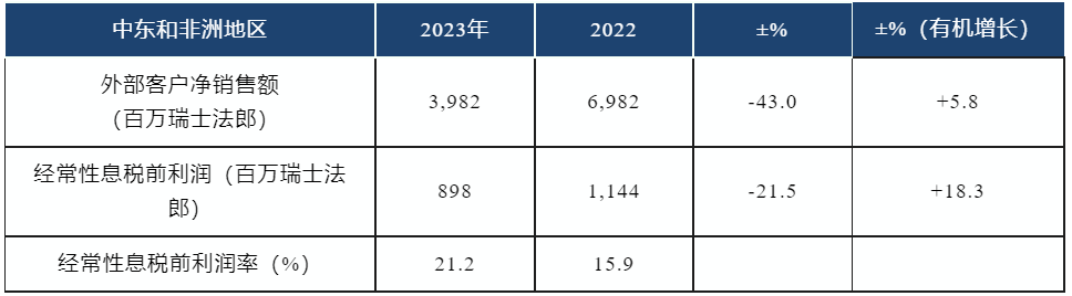 2023年,豪瑞在最具吸引力的市场实现快速增长。北美占集团净销售额3的39%,欧洲占34%,分别高于2018年的22%和28%。解决方案和产品占集团净销售额的比例从2018年的9%迅速扩大到2023年的21%,使得公司有望在2025年实现占该细分市场净销售额30%的战略目标。2023年,解决方案和产品的外部客户净销售额达到56.08亿瑞士法郎。
