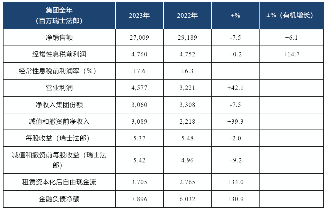 2023年全年净销售额为270.09亿瑞士法郎,同比增长6.1%。2023年经常税前利润达到创纪录的47.60亿瑞士法郎,与上一年相比有机增长14.7%。水泥、骨料和预拌混凝土价格高于成本的积极因素推动了这一创纪录的业绩。